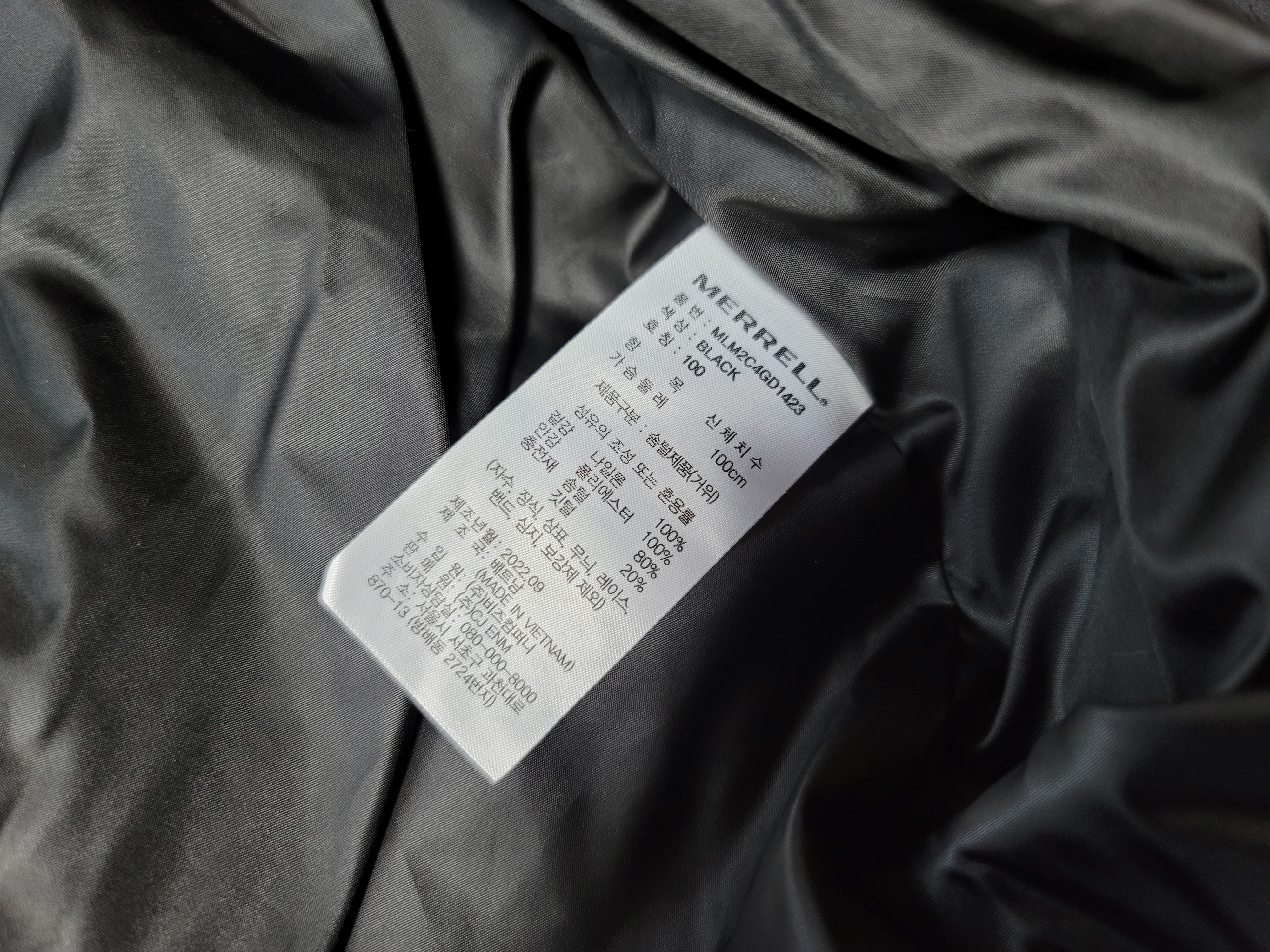 안쪽 마감도 깔끔하게 잘 되어 있고 구스다운 솜털 80% 깃털 20% 비율